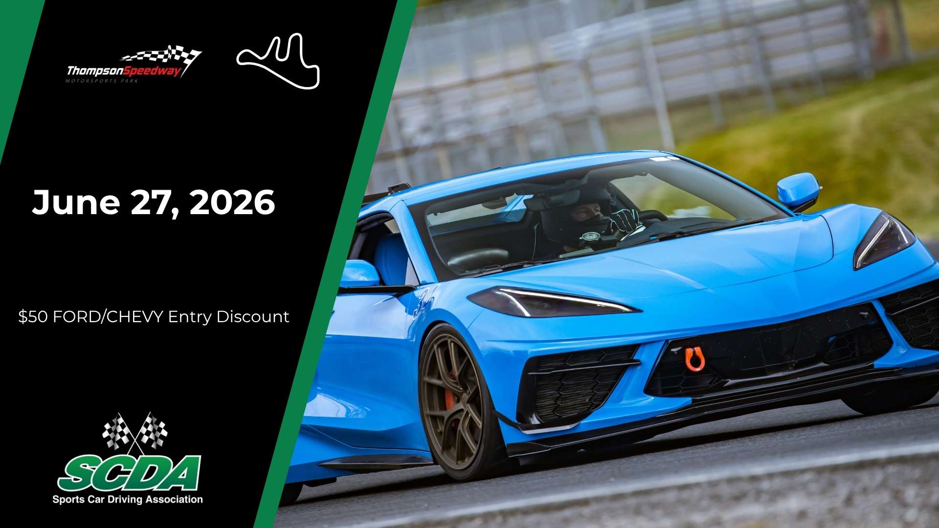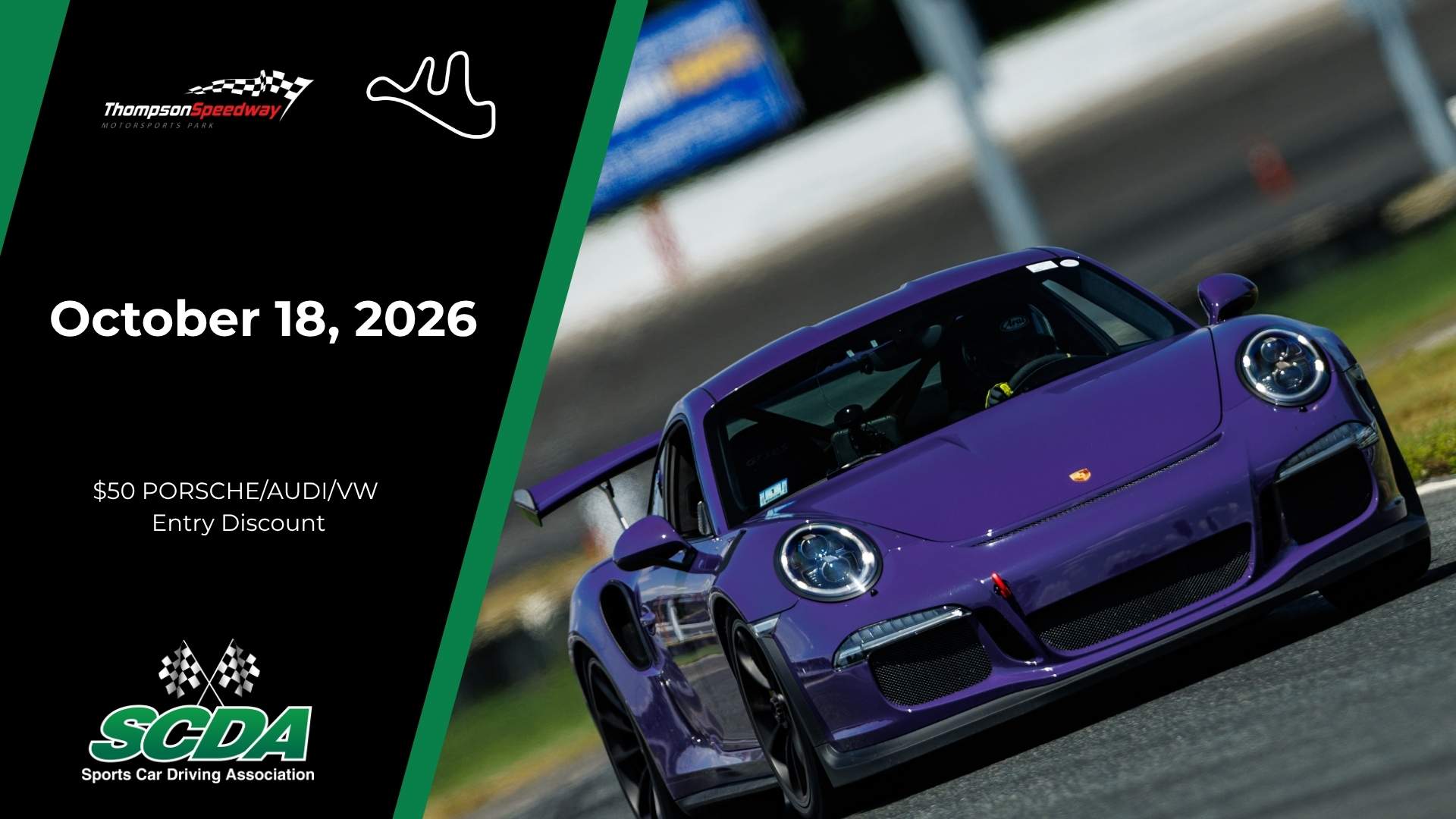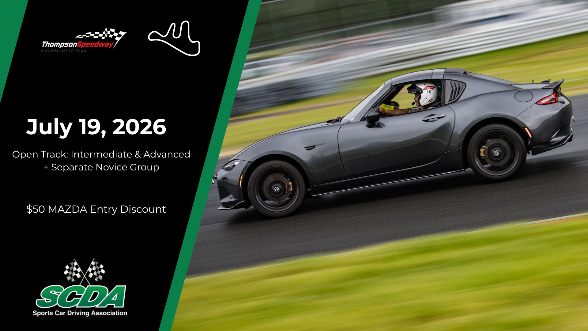 The SCDA will host events at Thompson Speedway Motorsports Park this season! This 1.7 mile road course has a nice mix of straights, challenging corners and some elevation changes. The pavement is brand new and the runoff areas are very forgiving. Located in Thompson Connecticut, this beautiful motorsports facility is a track that you must plan to drive.